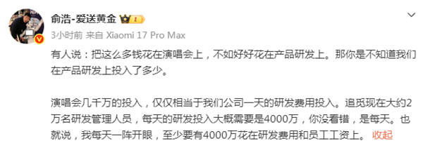 快科技2月7日消息,今日,追觅科技创始兼CEO俞浩发文回应外界办演唱会不如投研发、不如直接发钱的质疑。